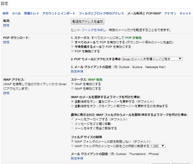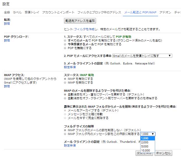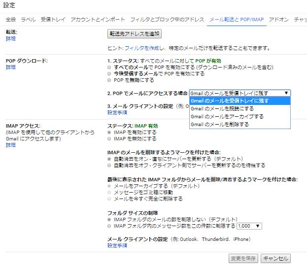「最後に表示されたIMAPフォルダからメールが消去されると:」
